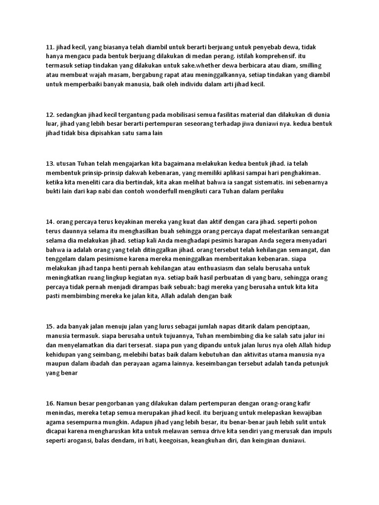 Jihad Perang itu Jihad KecilOleh. Contoh ini terdapat dalam Mujam al-Mufahras li Alfaz al-Quran. Web Bagi muslim jihad berarti perjuangan atau beruasaha dengan keras.